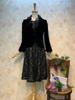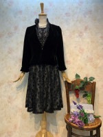 チュールレースとフロッキープリントが存在感を放つ七分袖ワンピースは、アクセサリーを合わせるだけで一枚映えしますが、秋冬に向けフロッキープリントの質感に合うベルベットジャケットを合わせるのがおすすめです。