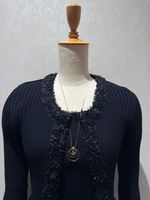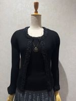 襟もとから前立て袖口にテープフリンジをあしらったリブカーディガン。伸縮性があるリブ編みは身体にフィットし、長過ぎない着丈はスカートとの相性も抜群です。縁取りに配したテープフリンジがシンプルな中にも可愛らしさをプラス。同素材フレンチスリーブプルオーバーCL-1139201と合わせればアンサンブルとして着ることができます。