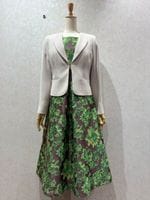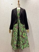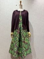 ブラウンのベースにグリーンの華やかな花柄ジャガードを使ったフレアーワンピース。フィットした上身頃にボリューム感のあるやや長めのフィット&フレアーシルエットは、とてもエレガントで人々の目を惹く特別な一着です。